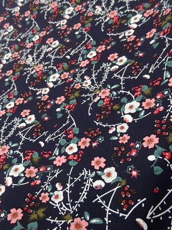 Ce tissu est une popeline coton bleu nuit au motif fleuri de teinte rose... il est souple, d'épaisseur...5.99€ TTC