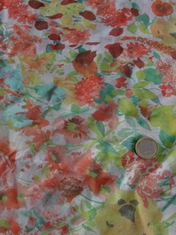 (ref : 1501) Taffetas ivoire motifs fleurs anis-orangé froissé permanent, des coutures...8.00€ TTC
