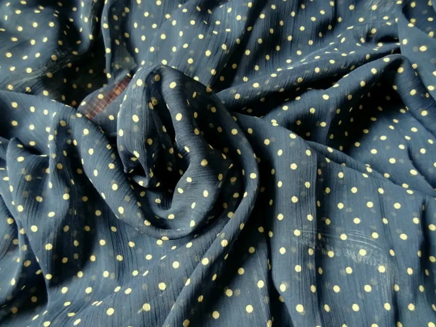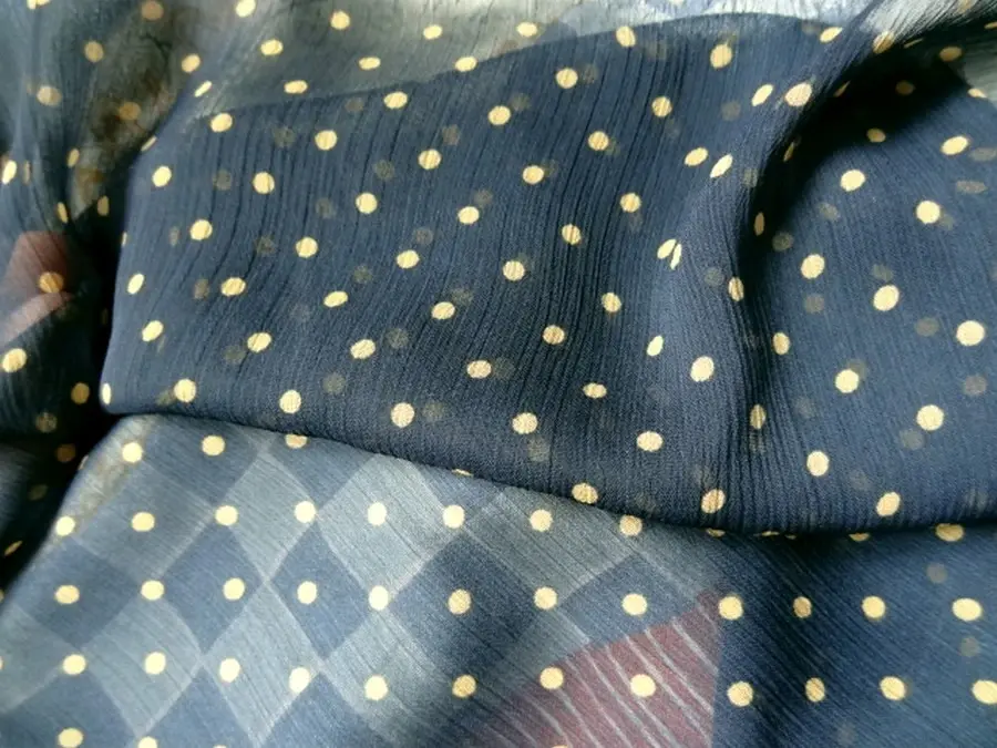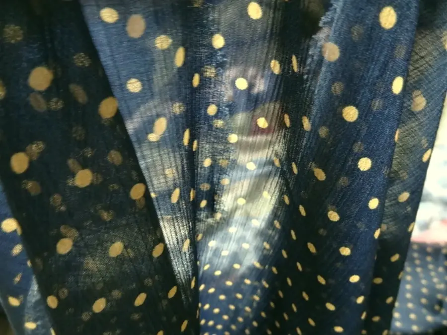 Coupon de mousseline bleu nuit à pois beige crème, très légère et transparente...