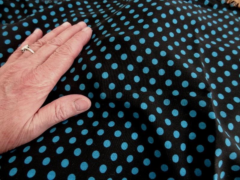 Microfibre noire à pois bleu canard très souple, sans aucune tenue, douce au toucher Elle peut servir pour réaliser des vêtements : robe, jupe...