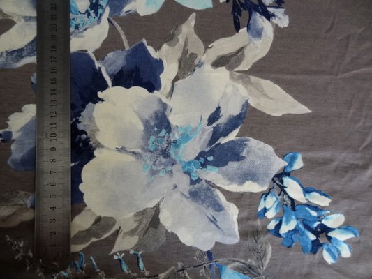 Coupon de jersey viscose lycra taupe avec 2 bandes de larges fleurs bleues sur la hauteur du tissu Ce tissu est lourd avec un joli tombant, fluide...