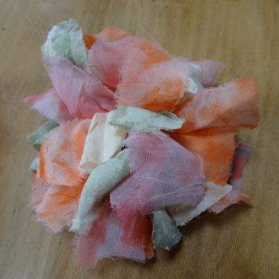 Il peut s’agir de reliquats de mercerie ou de couture tels que des bandes de tissu smocké, de pièces de tissu traitées, teintes ou peintes à la main comme cette pièce de patchwork en suédine peinte à la main, ou encore d’éléments de décoration textile comme la fleur à coudre en lin et dentelle noire.