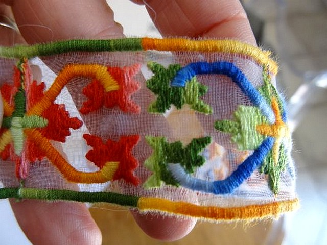 Broderie "Croix" en camaïeu multicolore sur fond d'organza blanc Il mesure 30 mm de largeur Il peut être utilisé en liseré...