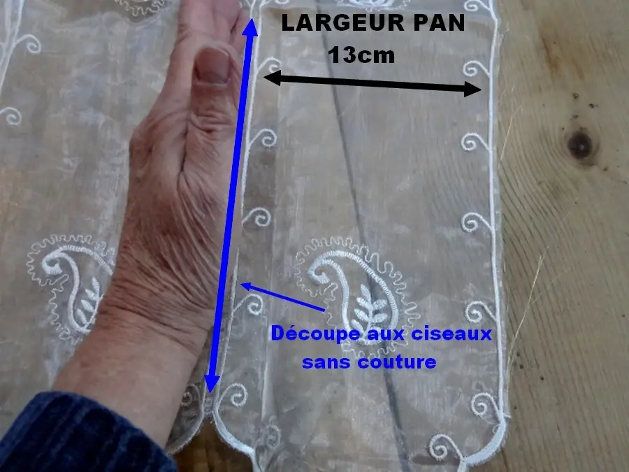 Brise-bise blanc en organza brodé à poser sans couture Il mesure 60 cm de hauteur VENDU par pan de 13 cm...