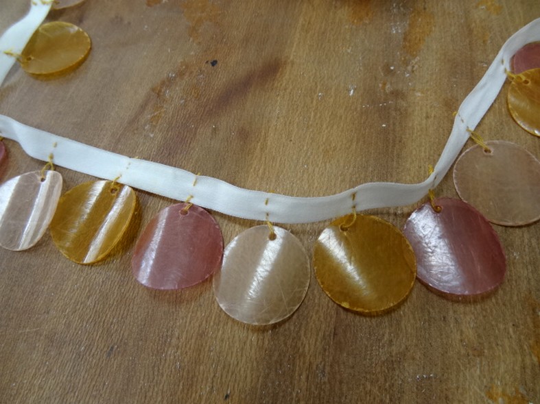 Galon élastiqué avec pastilles de nacre teintes pastel rose et ocre La bande élastique blanche mesure 1 cm de hauteur...