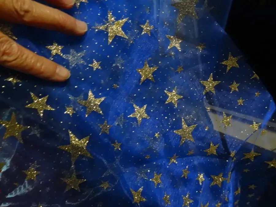 Organza polyester bleu foncé motifs étoiles or Ce tissu est fin, sec et chatoyant ...