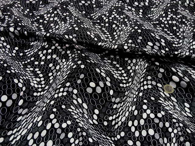 Ce tissu est un satin lycra noir à pois blanc avec un effet d'optique relief Il mesure 1.55 m de large Très souple et fluide, doux au toucher...