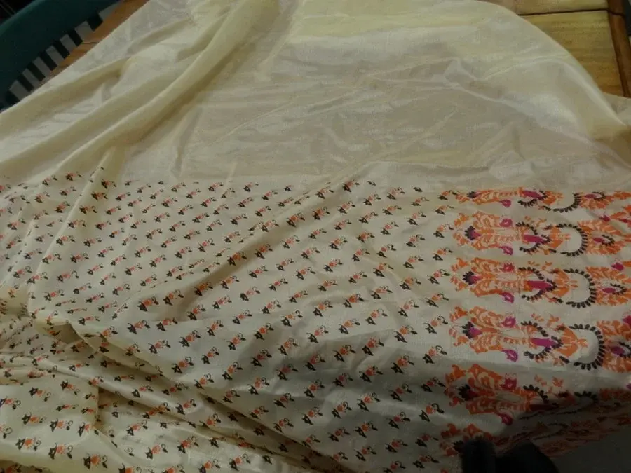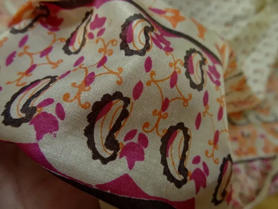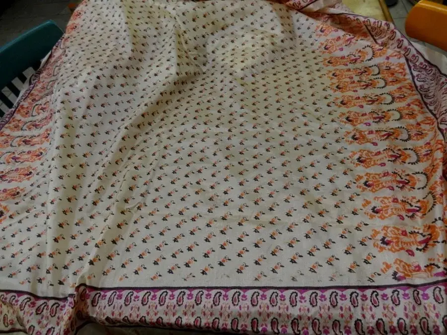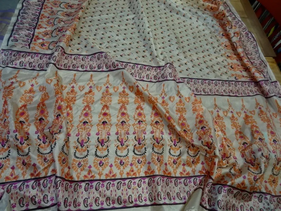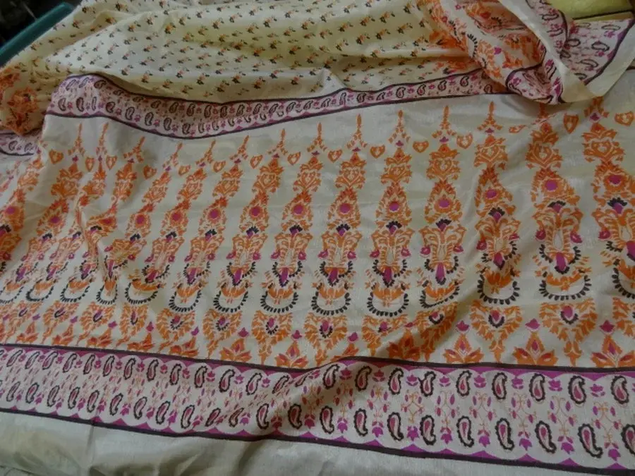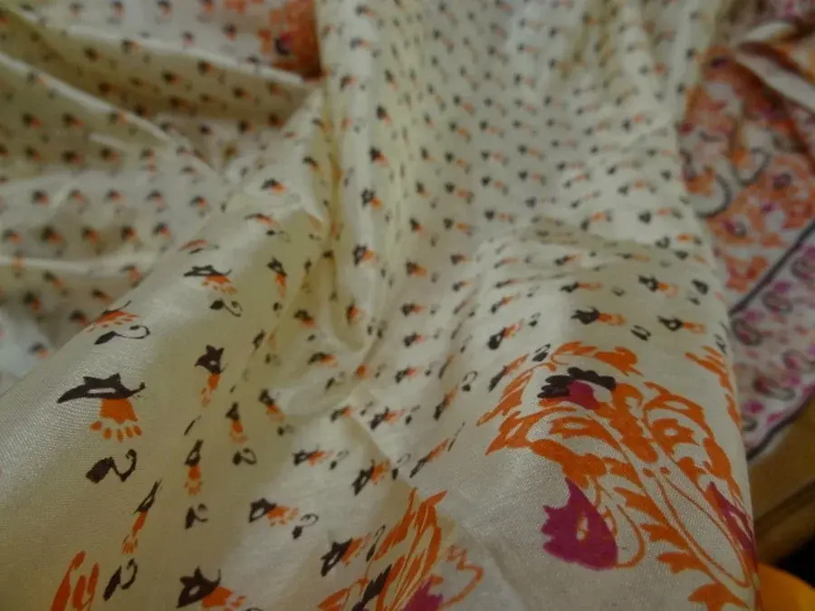 Ce tissu est une soie pongée fond écru avec motif cachemire orange et rose