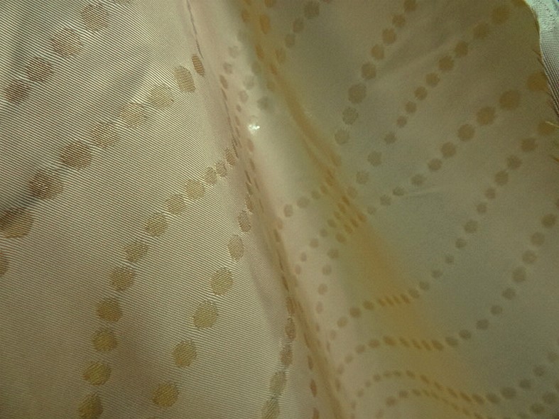 Taffetas or pâle avec un motif tissé formant des lignes sinueuses de pois tissu sec, cassant et un peu raide d'épaisseur moyenne...